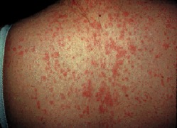 A red, splotchy rash that spreads from the face to the rest of the body but spares the palms and soles.